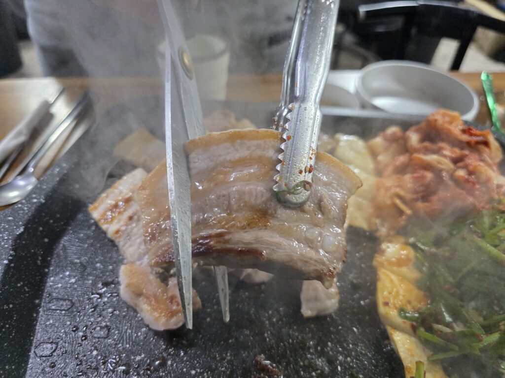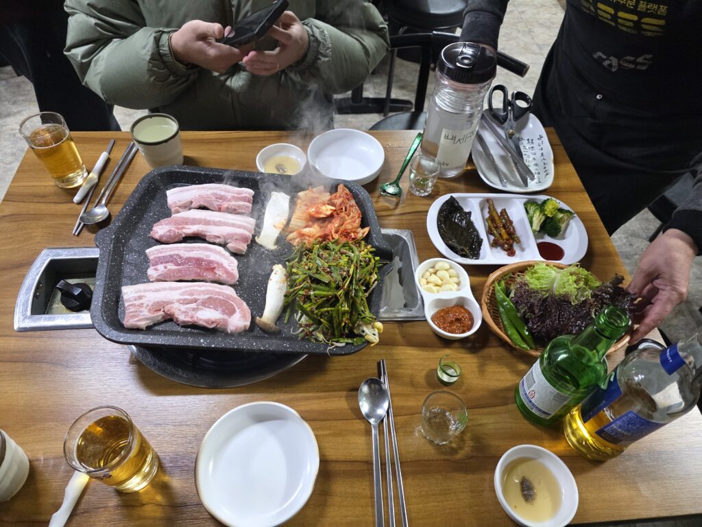 저는 개인적으로 신선한 생삼겹살을 주문했는데, 적당한 비계와 살코기의 조화가 환상적이었습니다. 씹을 때마다 고소한 육즙이 팡팡 터져 나오는데, 잘 익은 부추무침 한 점을 싸서 먹으면 입안에서 완벽한 밸런스를 이룹니다.